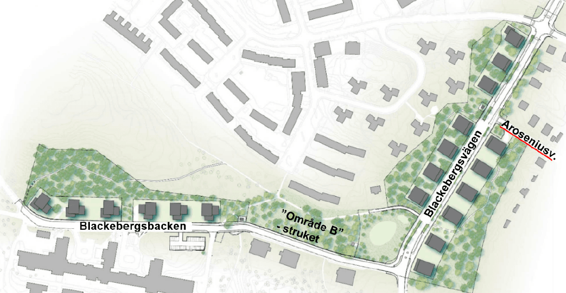 Längs Blackebergsvägen och Blackebergsbacken i stadsdelarna Södra Ängby och Blackeberg ska 19 punkthus uppföras i upp till 10 våningar för att ge området 380 nya bostäder. Den tillkommande byggnationen är en komplettering till de båda stadsdelarna Blackeberg och Södra Ängby för att binda samman dem och bryta den barriär som Blackebergsvägen idag skapar. Nästan hela exploateringen sker på uppskattade och gamla skogsområden. Träd- och naturinventering fastställde mycket höga naturvärden och protestlistor med 800 namnunderskrifter inkom till stadsbyggnadskontoret. Trots det valde man att fortskrida med planerna.