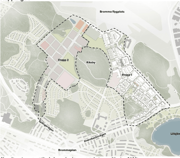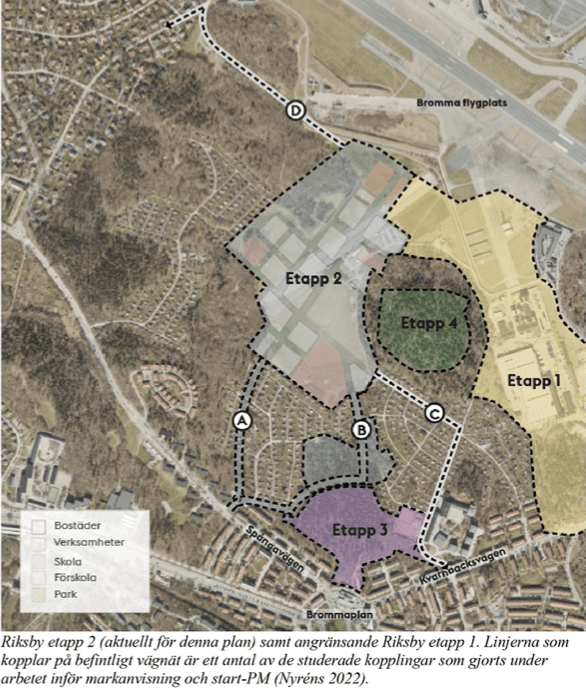 Planförslaget innebär att Riksby friområde och delar av Riksby klack söder om Bromma flygplats omvandlas till en stadsdel med bostäder och verksamheter, i enlighet med program för Centrala Bromma. Detaljplanen ska pröva omfattning, placering och utformning av cirka 1600 bostäder, en grundskola för ca 950 elever, förskolor, allmännaplatser och verksamheter. Utvecklingen av Riksby är en del av utvecklingen av centrala Bromma med Brommaplan som tyngdpunkt. Aktuell detaljplan utgör den andra etappen i arbetet med en ny stadsdel i norra Riksby. Tillsammans med kommande planer projekteras för fler än 3000 bostäder i området. Områdets västra del är i nuläget planerat som kontor, men beroende på hur det blir med Bromma flygplats, kan kontorsdelen bli bostäder om flygplatsen stängs.