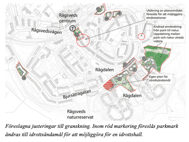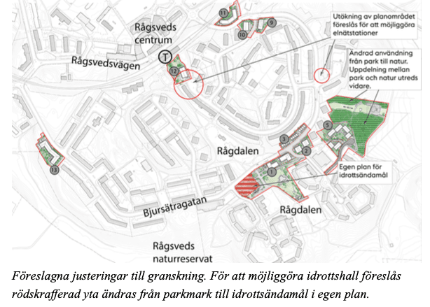 Södra Rågsved föreslås att förtätas med 430 lägenheter samt en idrottshall. vid Bjursätragatan söder om Rågsveds T-banestation. Nybyggnationen sker i upp till 7 våningar på befintlig parkmark och grönområden. Bland annat bebyggs Rågdalen med en idrottshall. Visserligen är idrottshallen ett välkommet tillskott men det är beklagligt att de nya flerbostadshusen innebär att värdefulla grönområden används för att uppföra idrottshallen. Stadsbyggnadskontorets inriktning är att det ska uppföras med hög arkitektonisk kvalitet men i verkligheten visar visionsskisserna på själlösa fyrkantiga hus som gör området gråare.