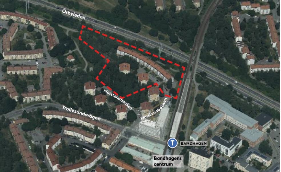 Plan för 85 bostäder i tre punkthus och ett lamellhus längs med Mosstenabacken i Bandhagen, ärende 2022-02627. Bandhagens ursprungliga bebyggelsegrupper, uppförd under tidigt 1950-tal. Detta syftar till att komplettera de sju punkthusen och ett längre lamellhus intill skogen mot Stureby invid T-banan. Marken inom planområdet är nu främst natur- och parkmark med varierad vegetation.