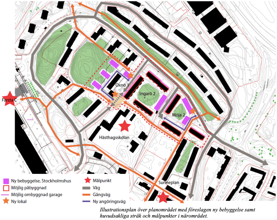 Förslaget är att bygga cirka 125 nya bostäder i modell Stockholmshus samt att göra om– och tillbyggnad av befintliga bostadshus i centrala Farsta. Larsbodavägen och Torsbygatan föreslås utvecklas som stråk med fokus på gående och cyklister. I kvarteret Möja 2 och Ingarö 2 föreslås befintliga kvarter få kompletterande bebyggelse. I kvarteret Oxnö 1 föreslås det befintliga skivhuset ramas in av ny bebyggelse i lägre skala. Den befintliga paviljongen föreslås bevaras och tillsammans med kringliggande allmän plats utvecklas som en målpunkt i området. Samtliga kvarter ska utformas för att tillhandahålla ekosystemtjänster (vad nu detta är). Låga parkeringstal föreslås tillämpas i syfte att minska trafik till området och möjliggöra en ändrad användning av befintliga parkeringsytor och garage.