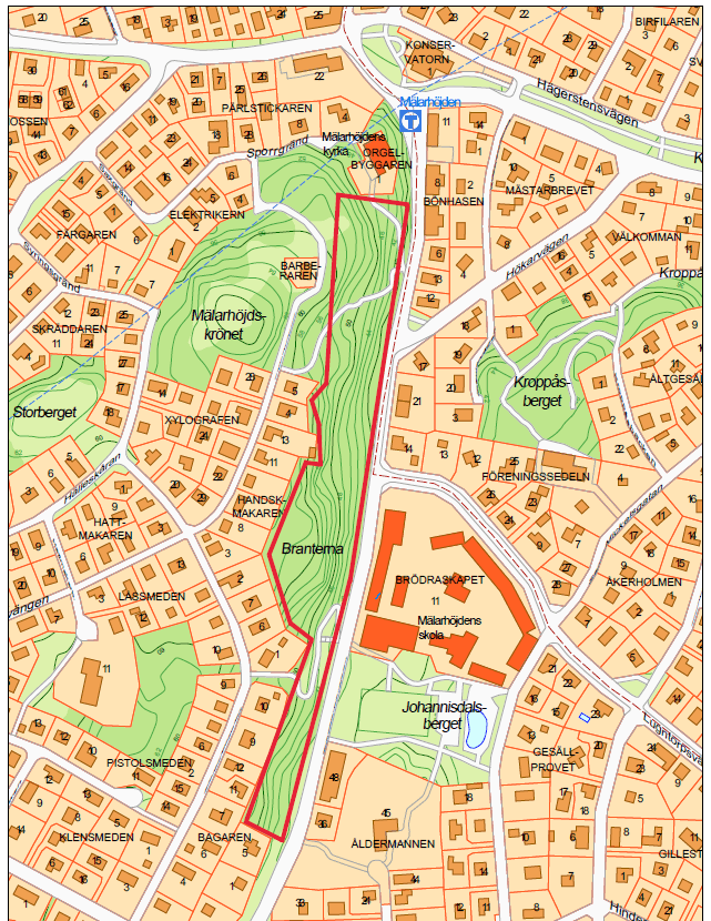 Det aktuella planområdet är ett parkområde kallat Branterna, ett över 500 meter långs naturområde beläget intill Mälarhöjdens T-banestation längs Slättgårdsvägens västra sida från Mälarhöjdens kyrka i norr till kvarteret Bagaren i söder. Området består av naturmark bevuxen med blandskog och berg i dagen och området karakteriseras av en brant topografi.