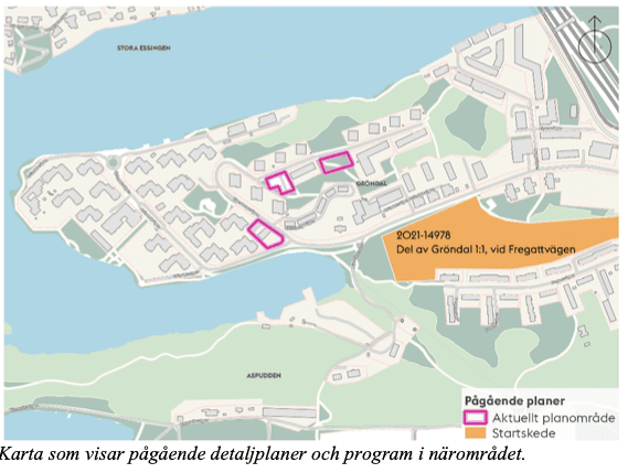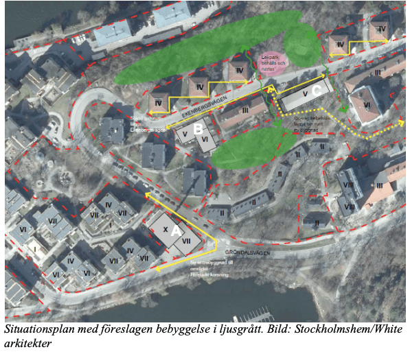 Staden planerar för cirka 100 bostäder, varav cirka 20 lägenheter i Stockholmshus, i tre byggnader vid Ekensbergsvägen och Gröndalsvägen. Det gångstråk som förbinder Ekensbergsvägen med Gröndalsvägen österut får ny placering.