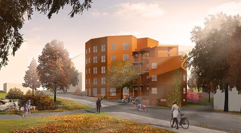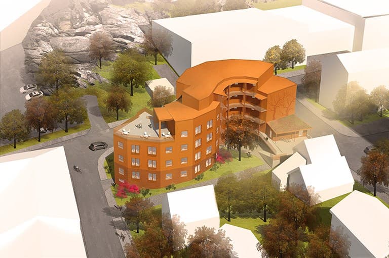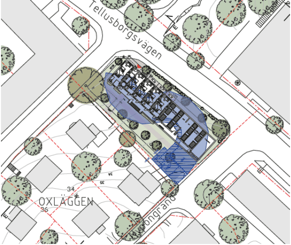 Den nya byggnaden ska ska vara slank i likhet med den omgivande lamellhusbebyggelsen och därmed, enligt kontorets bedömning, ansluta till Tellusborgsvägen övriga bebyggelse. Byggnaden föreslås fortfarande, liksom i det överklagade förslaget ha en höjd om fyra till fem våningar.
