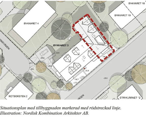 SD föreslog att det skulle avslås med motiveringen att flerfamiljshuset på fastigheten Bykkaret 3 uppfördes i harmoni med de på grannfastigheterna på Bykkaret 4, 5 och 6. Ett bifall av förslaget hade öppnat upp för liknande åtgärder på resterande tre fastigheter – på bekostnad av arkitektens gestaltningsidé om byggnadernas symmetri men också på områdets grönska och lummighet.