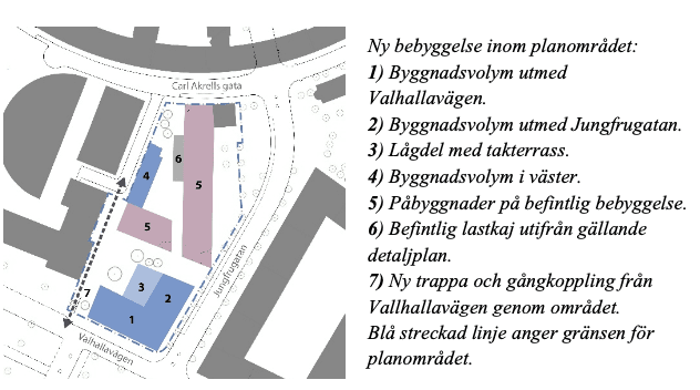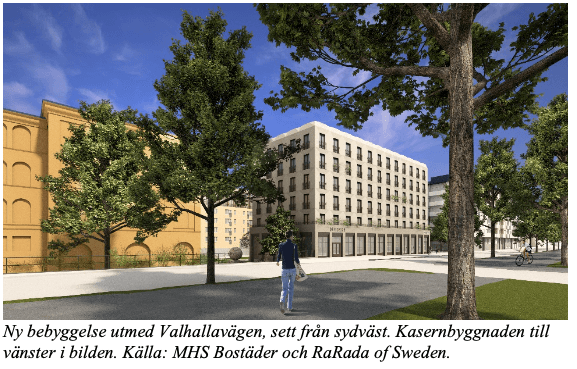 Det planeras för ny bebyggelsen i fyra till sex våningar i två sammansatta volymer utmed Valhallavägen och Jungfrugatan, där en är ny och en som påbyggnad av existerande hus. En andel av de nya bostäder avser bostäder för Försvarsmakten.