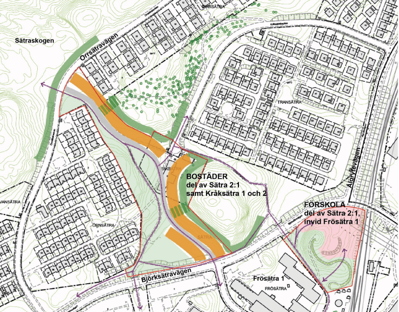 Förslaget omfattar 45 radhus med två våningar mellan Örnsätrabacken, Kråksätrabacken och Björksätravägen, ärende 2016-17314. Förskolan Kråksätrabacken 103 föreslås ersättas med en ny förskola på en närliggande plats. Den stora exploateringen sker på ett parkstråk mellan småhusområden och kan påverka naturvärdena genom ökad förtätning, då området omges av trädbevuxna hällmarkshöjder.