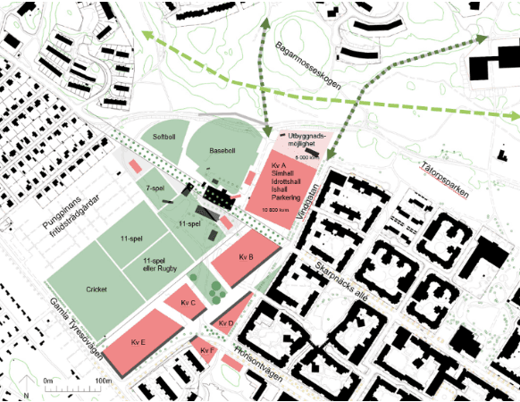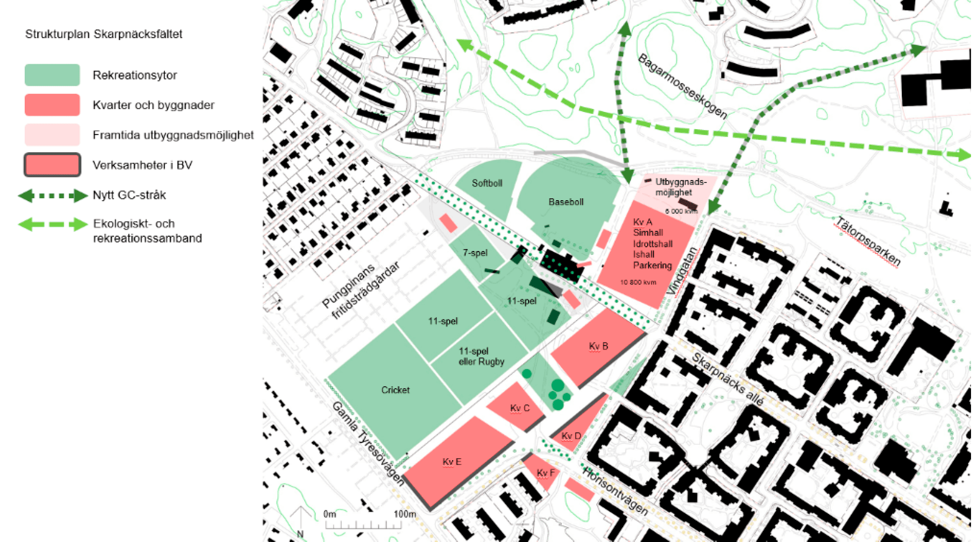 Skarpnäcksfältet föreslås förtätas med 500 bostäder i sex kvarter på upp till fem våningar. I byggnadsprojektet inkluderas även en ny idrottshall, simhall samt ishall vilket innebär ett positivt tillskott till området. Ett förslag till ny detaljplan ska tas fram för området vid Skarpnäcksfältet. Enligt start-PM är förslaget tänkt att innehålla nya idrottsfunktioner, cirka 500 bostäder och lokaler för mindre verksamheter. Projektet kommer delas i etapper, i den första etappen ingår endast idrottsfunktioner.