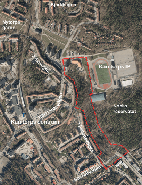 Skogspartiet mellan Björkhagen och Bagarmossen, längs med Kärrtorps IP, föreslås att bebyggas med 600 lägenheter i ett flertal flerbostadshus. Av dessa avses cirka 400 utgöra hyresrätter för Svenska bostäder och cirka hälften av dessa föreslås vara Stockholmshus. De övriga 200 lägenheterna kommer att föreslås anvisas för bostadsrätt. Dessutom planeras för en förskola i området. De flesta husen blir 4-6 våningar höga men två hus med fler våningar planeras vid Sockenvägen.Skogsområdet ligger direkt i anslutning till Nacka naturreservat med höga naturvärden.